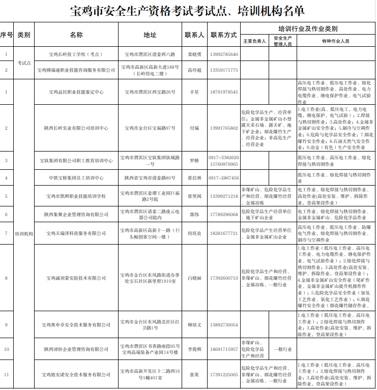 宝鸡市安全生产资格考试考试点、培训机构名单