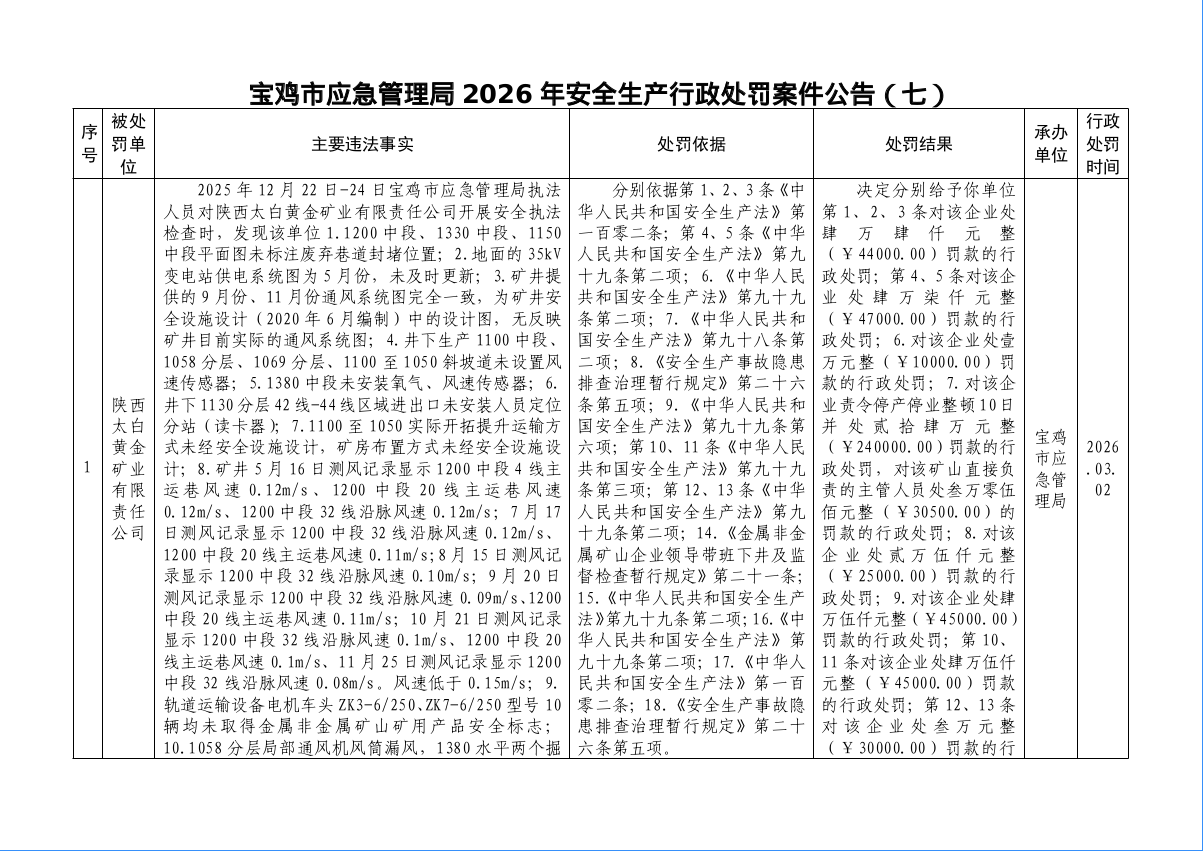 宝鸡市应急管理局2026年安全生产行政处罚案件公告(七)