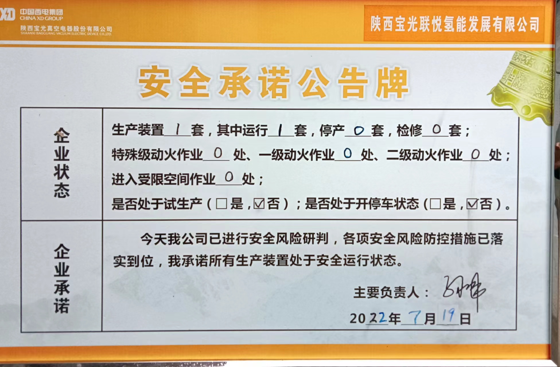 7月19日陕西宝光联悦氢能发展有限公司安全风险承诺公告