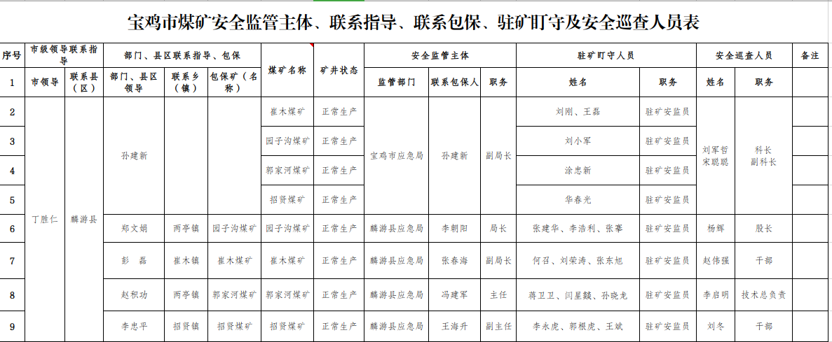 附件:宝鸡市煤矿安全监管主体、联系指导、联系包保、驻矿盯守及安全巡查人员表