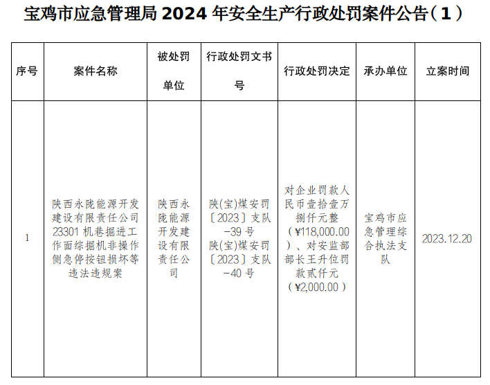 宝鸡市应急管理局2024年安全生产行政处罚案件公告(1)