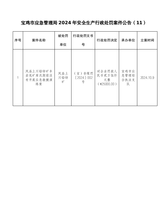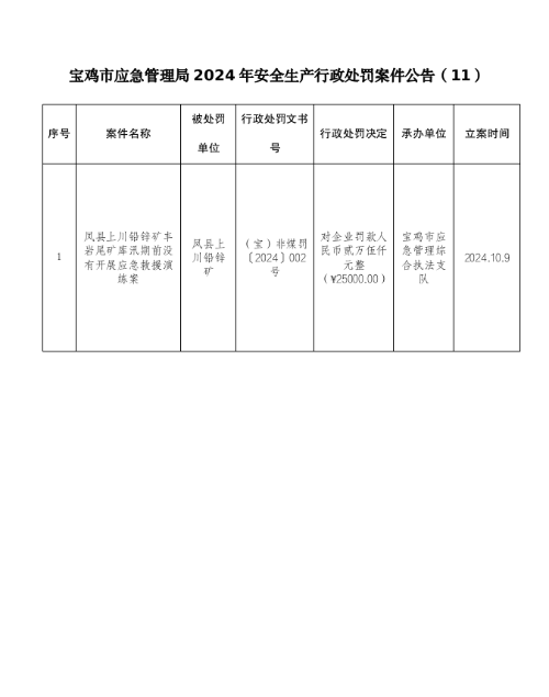 宝鸡市应急管理局2024年安全生产行政处罚案件公告(11)