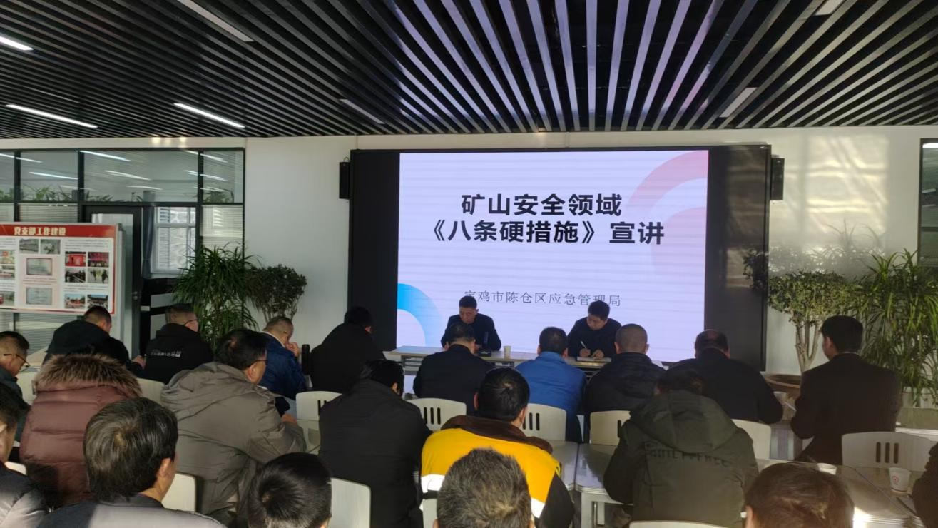 为持续推进《关于防范遏制矿山领域重特大生产安全事故的硬措施》(以下简称《八条硬措施》)刚性贯彻落实到基层一线和矿山企业,提升矿山企业安全基础保障水平,2月13日、2月17日,陈仓区组织业务骨干,集中两天时间,开展进企业宣贯《八条硬措施》活动。